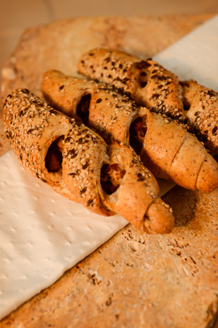 Zutaten:*VOLLKORN-WEIZENMEHL, Wasser, *Hefe, *Maismalz, Salz, 5%*Bauchspeck [( Schweinebauch(98%), Pökelsalz, Gewürze, Rohrohrzucker)], *SESAM, *Leinsamen....*aus biologischen Anbau