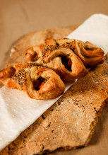 *VOLLKORN-WEIZENMEHL, Wasser, *Hefe, *Maismalz, Salz, 5%*Schinken [(Schweineschlögl(91,5%), Wasser, Pökelsalz, Kräuter, ...