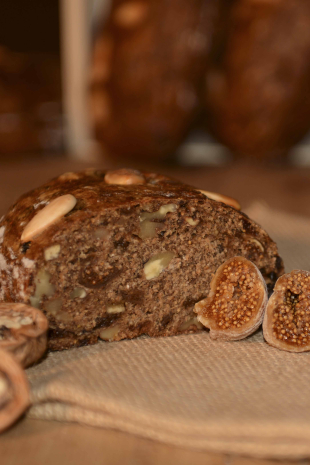Zutaten:55%*Kletzen(Birnen), *VOLLKORN-ROGGENMEHL, *VOLLKORN-DINKELMEHL, *ROGGENSAUERTEIG, Wasser, *WALNÜSSE, *Rosinen, *Feigen, *MANDELN, *Hefe, *Rum, Salz....*aus biologischen Anbau