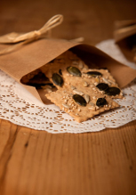 *Vollkorn Dinkelmehl, *Kürbiskerne, *Honig,*Eier, *Sonnenblumenk.Öl, *Gewürze .*aus biologischen Anbau